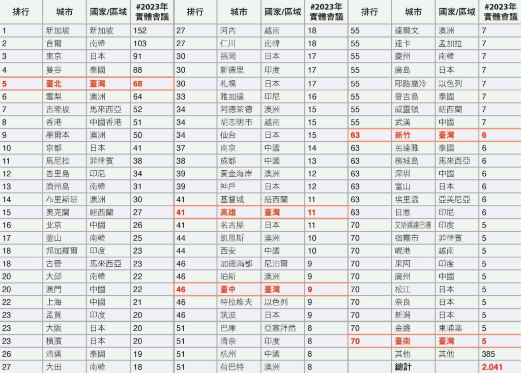 此外,值得關注的是,我國還有四個城市同時上榜,包括高雄、臺中、臺南及新竹,新竹為首次入榜,在亞太城市排第63名,前三個城市排名依序為41、46、70名,相較2022年名次皆有倒退情況。ICCA執行長Senthil Gopinath指出,在全球城市年度排行榜中,新加坡更是強勢擠進第二名,突顯亞太地區於疫情過後,各城市積極展現會展產業強勁的復甦力道,預期未來競爭將更加激烈。