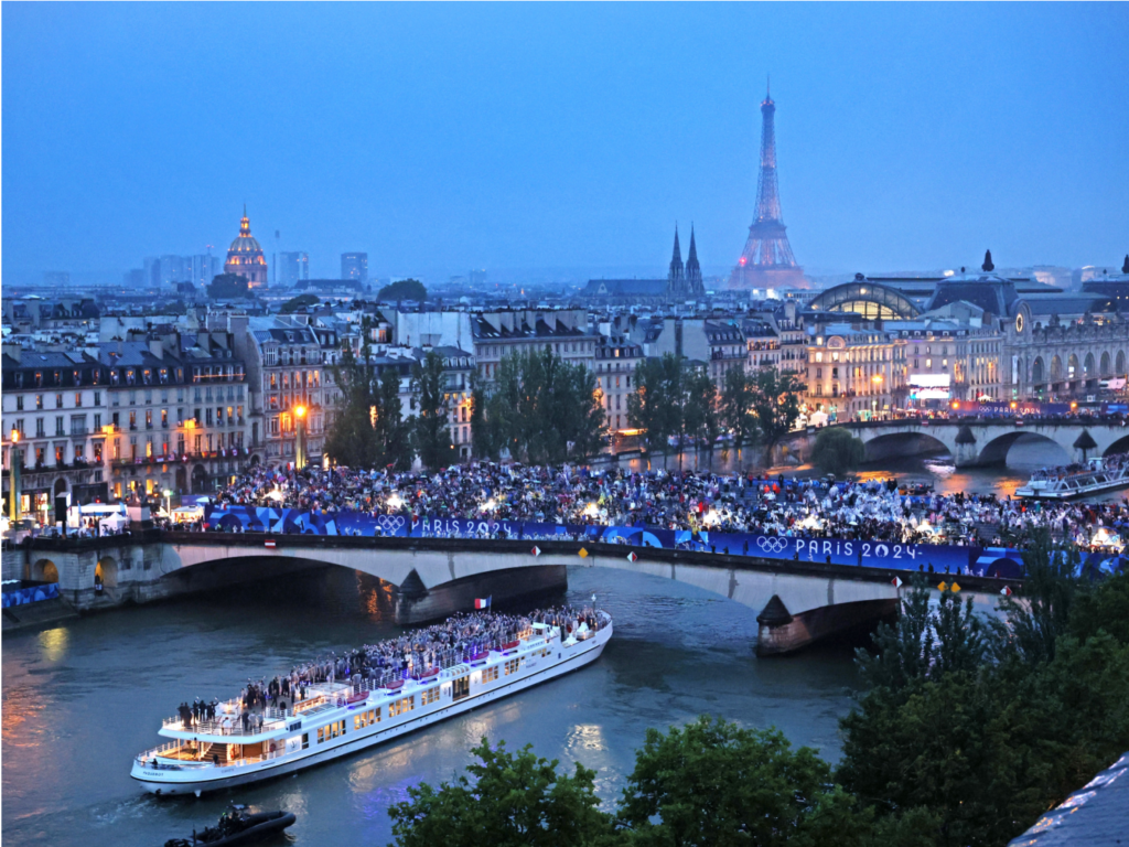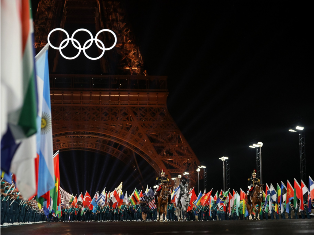 2024奧運開幕於臺灣時間7月26日凌晨1時30分在法國巴黎華麗登場,此為時隔百年後再次舉辦夏季奧運會,並破天荒首創在6公里長的塞納河舉行「水上開幕典禮」,百艘船隻乘載每個國家或地區共206個代表隊,於雨中河畔浪漫入場,和河面光影、燈光秀相互魔幻照映。開幕演出則以城市的神秘火炬手為引路人,帶領全球觀眾飽覽法國的時尚藝術、歷史文化、城市建築等,並善用虛實整合視覺穿透於直播中,當中更邀請到席琳狄翁和Lady Gaga展開巔峰演出,最後以聖火熱氣球冉冉升空,為世界級運動盛會精彩揭開序幕。
